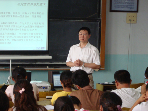 王旭春处长在会上为同学们播放了短片《阔步在希望的征程上》, 并作了题为《新起点、新征程,积极进取、展现风貌,让生命更为精彩》的讲座。讲座强调了研究生教育的重要意义,介绍了研究生的管理和组织机构,向同学们展示了我校研究生教育的总体情况以及近年来所取得的成效,并就“怎样才能成为一名合格的研究生”、“研究生风貌”、以及“做学问和人生的关系”等几个问题与同学们进行了交流和探讨。