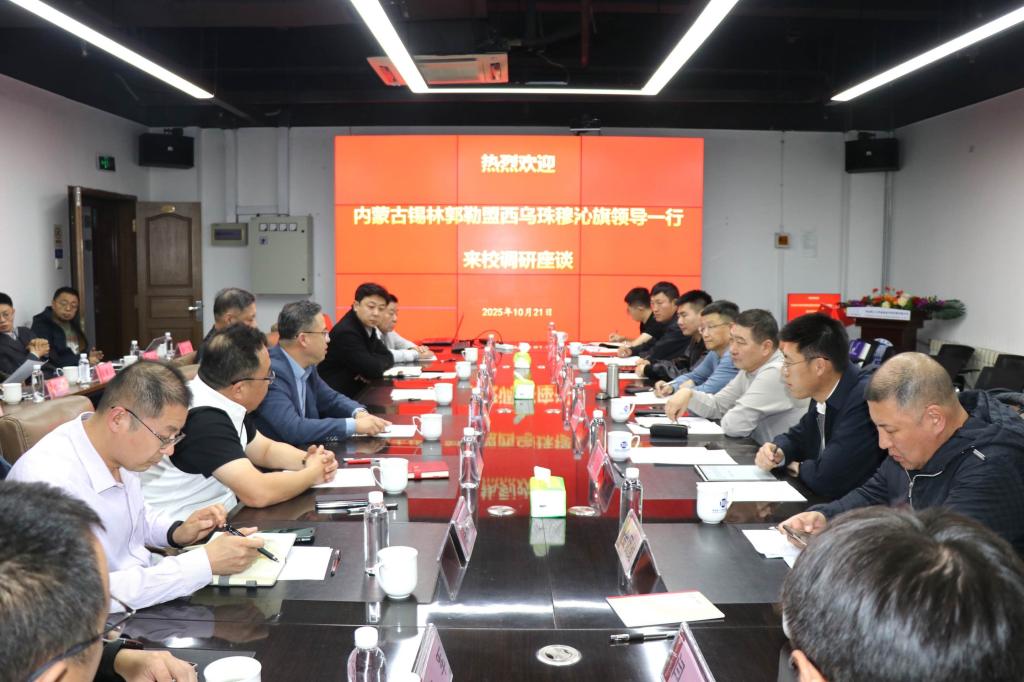10月21日,内蒙古锡林郭勒盟西乌珠穆沁旗人大常委会主任宝力道、旗委常委、人民政府副旗长吕文兴一行来校调研交流。校党委常委、副校长陈连军出席座谈并致辞,科发集团董事长、总经理牛犇主持座谈。
