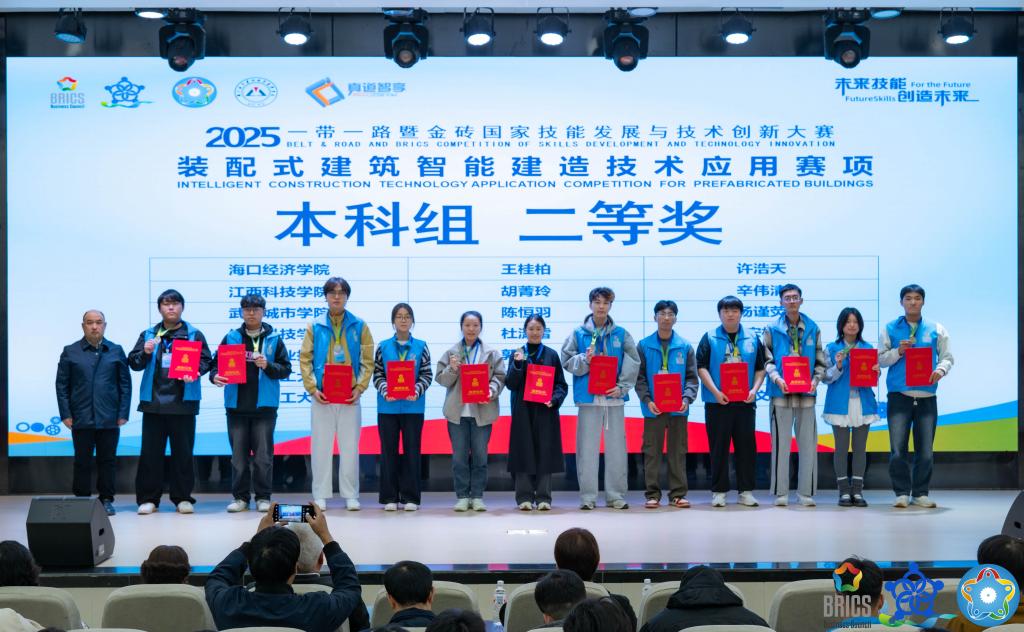 10月24日,2025“一带一路”暨金砖国家技能发展与技术创新大赛——装配式建筑智能建造技术应用赛项全国总决赛圆满落幕。赛事系全国普通高校大学生竞赛排行榜目录内赛事,共吸引全国436支队伍,872名选手参与角逐,200支队伍入围决赛。土木工程学院两支参赛队伍凭借扎实的专业技能、默契的团队协作与创新的技术应用脱颖而出,双双荣获全国二等奖,学校因赛事组织工作的突出表现,获评“优秀组织奖”。