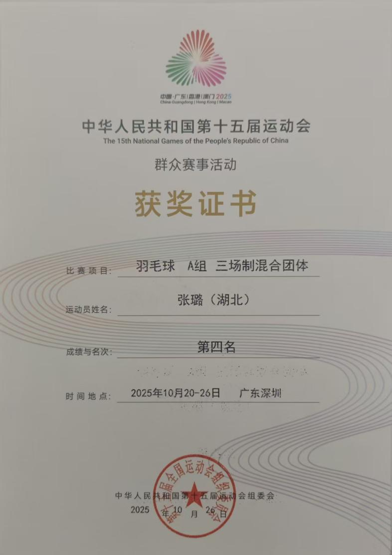 近日,中华人民共和国第十五届运动会群众比赛羽毛球项目在深圳市体育中心圆满落幕。我校体育教学部青年教师、国家级健将张璐作为湖北省代表团主力成员,在竞争激烈的A组三场制混合团体赛中发挥出色,与队友奋勇拼搏,最终斩获第四名的佳绩,充分展现了我校教师良好的精神风貌与专业素养。