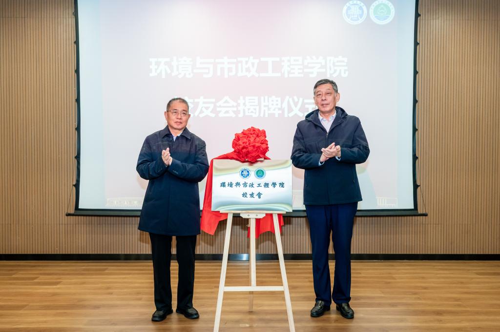 水80级校友周善东、水81级杨兴昌共同为“环境与市政工程学院校友会”揭牌。陈伟等领导向首届校友会组织机构成员及校友班主任颁发聘书。