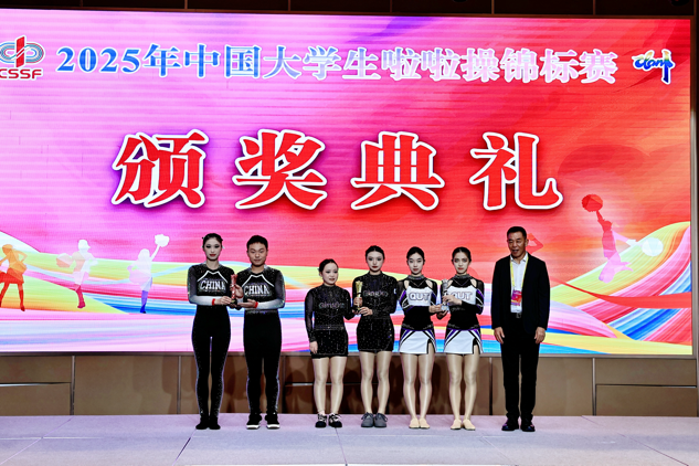 近日,2025年中国大学生啦啦操锦标赛在海南省儋州市举办,我校共派出17名队员参赛。本次比赛由中国学生体育联合会主办,是国内竞技水平和含金量最高的大学生啦啦操赛事,吸引了来自近90所高校1500名运动员参赛。经过预决赛的激烈角逐,我校分别在甲A组双人花球自选动作获得亚军,甲A组集体自选花球动作获得季军,甲A组规定花球动作获得第四名的好成绩,叶明亮老师获“优秀裁判员”荣誉称号。