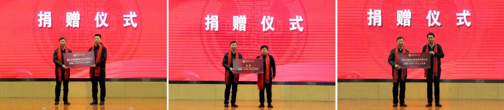 工程管理专业12级校友曹福帅、工程监理专业07级校友刘滨、土木工程专业09级校友杨文元向临沂校区捐赠,临沂校区管理办公室主任杜方代表校区接受捐赠。