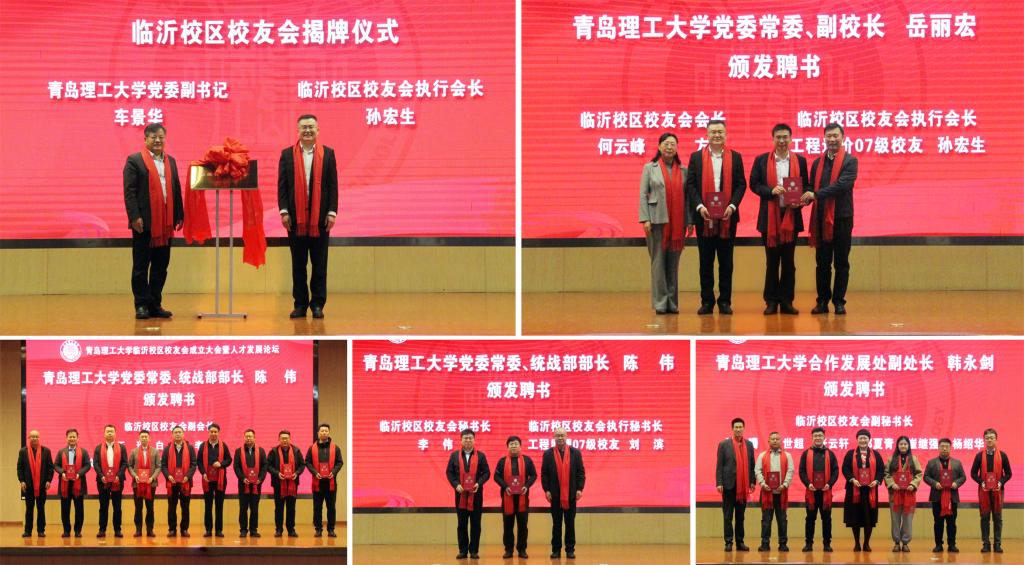 与会领导为“临沂校区校友会”揭牌,并分别为校友会会长、执行会长、副会长、秘书长、执行秘书长、副秘书长颁发聘书。