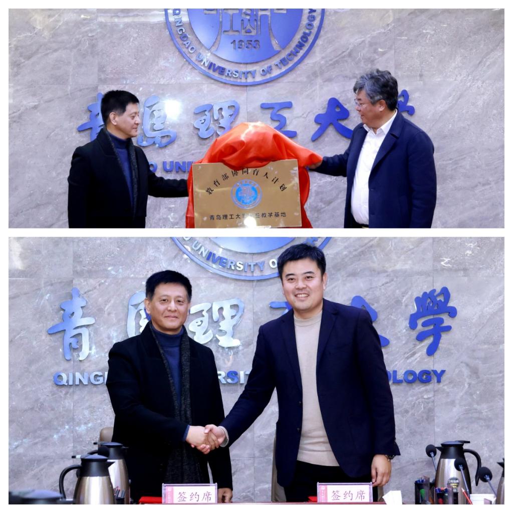 苗吉军、滕浩共同为“青岛理工大学航空教学基地”揭牌。贾玉跃、滕浩分别代表校企双方签署合作协议。