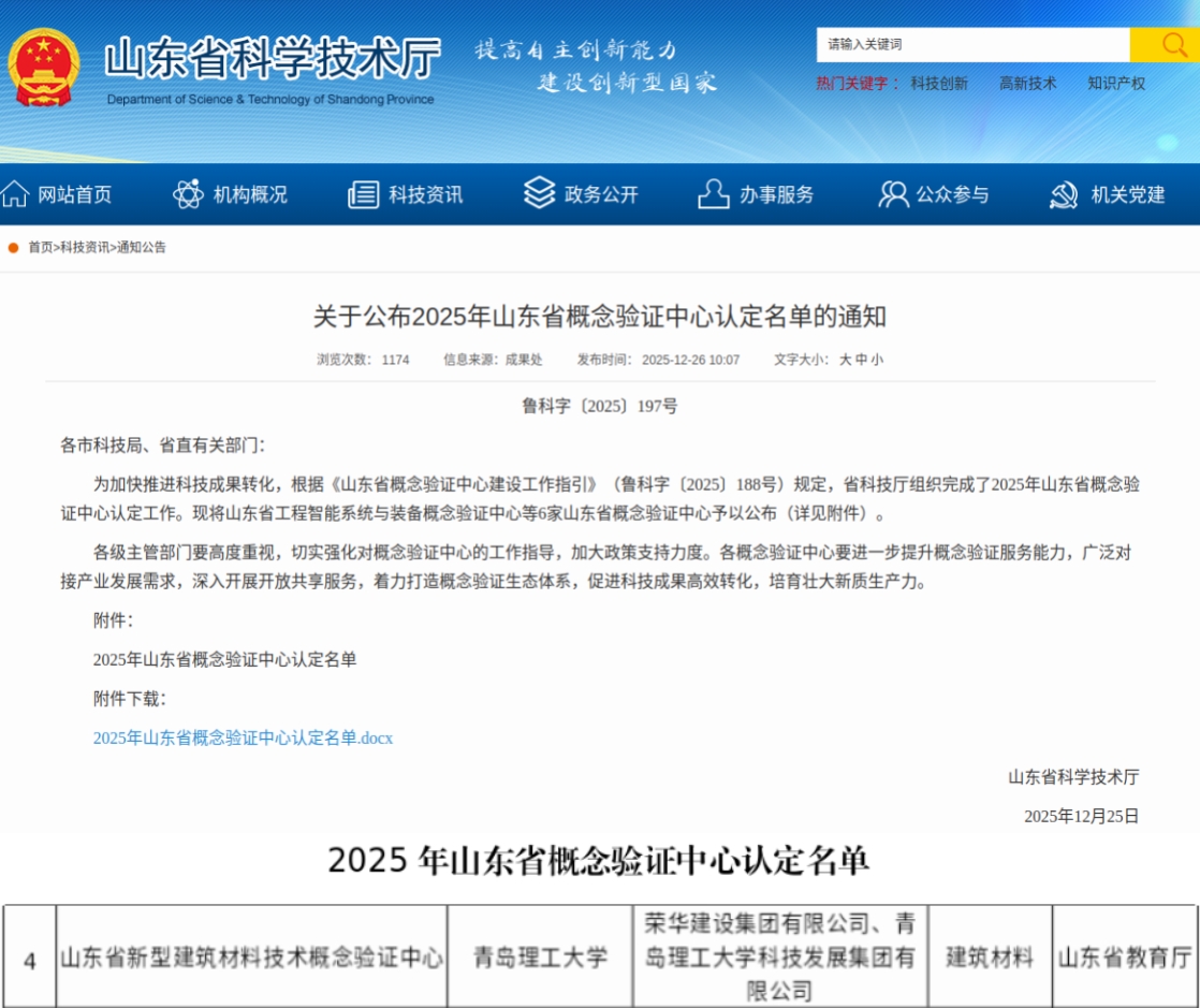 近日,山东省科技厅正式公布“2025年山东省概念验证中心认定名单”,由我校牵头申报的“山东省新型建筑材料技术概念验证中心”成功入选。该中心的获批,标志着学校在省级概念验证中心建设上实现零的突破,是打通科技成果转化“最初一公里”的关键进展。