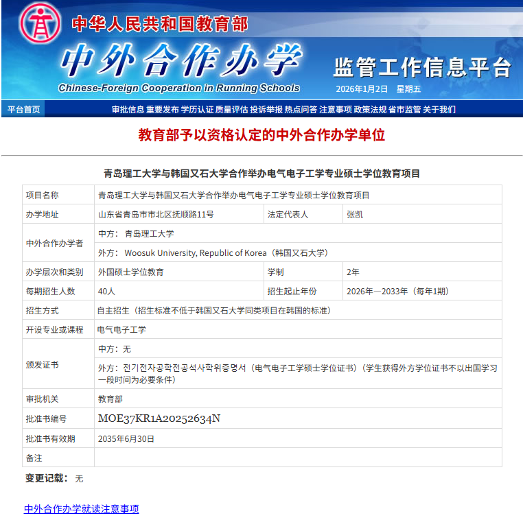 12月31日,教育部公布了2025年下半年申报的中外合作办学机构/项目批复结果,青岛理工大学与韩国又石大学合作举办的电气电子工学硕士项目,正式通过教育部资格认定并在中外合作办学监管工作信息平台公布。该项目不仅是我校首个硕士层次中外合作办学项目,也是山东省内电气工程领域首个同类硕士项目。