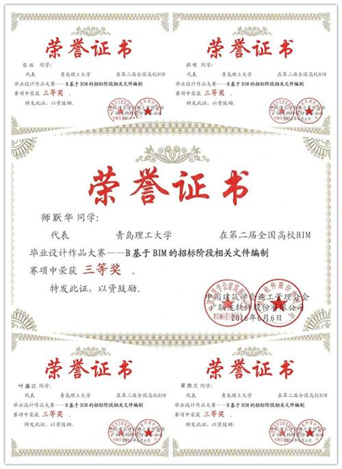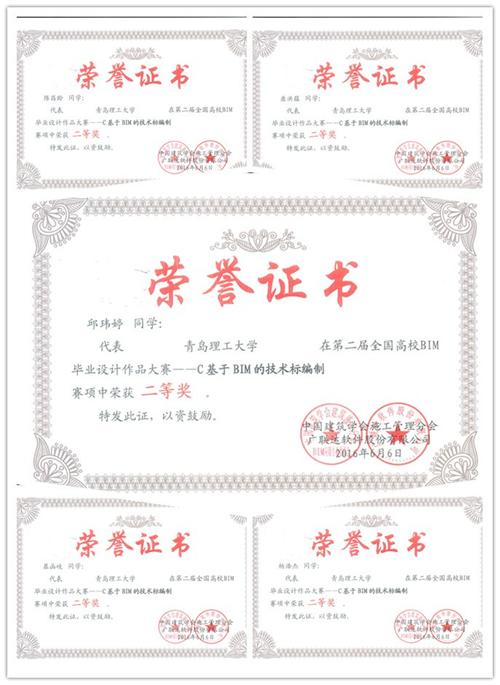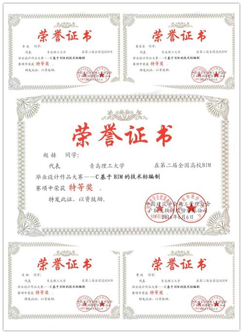 管理学院领导高度重视,精心组织,依托工程管理、工程造价省级品牌、特色专业,从师资、资金、技术等方面提供全方位服务与支持。从2016年1月份全国大赛开赛以来,参赛同学和指导老师付出了巨大努力。在专业教师的精心指导、学生的热情参与、团队成员团结协作和精心准备下,管理学院工程管理专业“恒韧”团队(指导教师王志强、胡龙伟)在提交的作品和现场答辩环节获得了评委组的高度认可,荣获团队特等奖,并获得广联达BIM5D软件应用技能认证证书;国际工程项目管理专业“飞-跃-队”(指导教师姜吉坤、曹卫群)、工程造价专业参赛队伍(指导教师李松青)分获C模块二等奖、B模块三等奖。