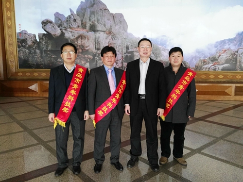 科技处长王旭春与三位科技工作者在颁奖会后合影(左1:陈成军。左2:金祖权。右1:张纪刚)