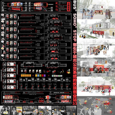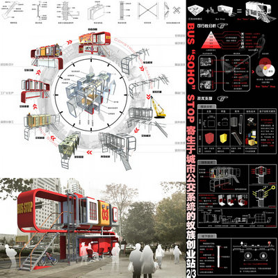 王轶群、史凌微的获奖作品将视野放宽到整个城市,力图营建一个城市系统而非单栋建筑。在对国内蚁族生活现状进行充分的调查研究后,考虑到创业优势,选址于人流量较大的城市公交站点,将生活、创业“SOHO”模块与公交车站结合,运用多种绿色技术解决环境与居住的矛盾,将标准化生产与适应型设计相结合,能迅速满足大量蚁族不同的创业需求。另一名获得一等奖的是重庆大学选送的作品《艺术激活城市——十四号桥洞社区》。