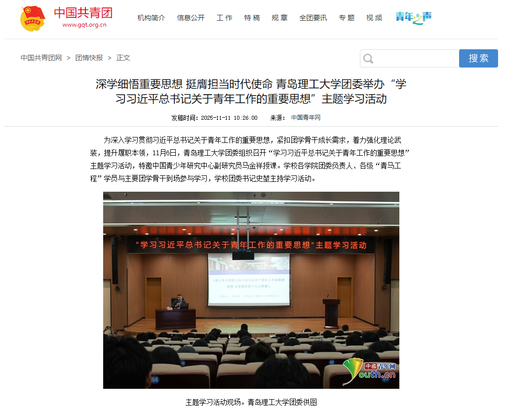 【中国青年网】深学细悟重要思想 挺膺担当时代使命 青岛理工大学团委举办“学习习近平总书记关于青年工作的重要思想”主题学习活动
