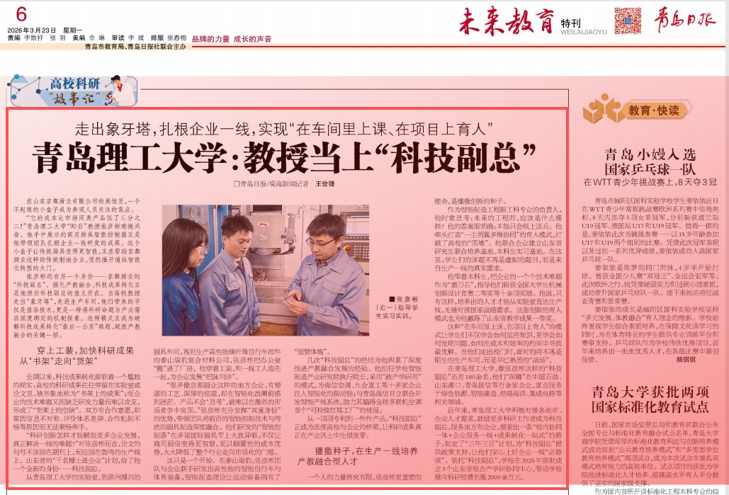 近年来,青岛理工大学积极对接各地市、企业人才需求,鼓励更多科研工作者成为科技副总,服务地方和企业,摸索出一条“校内协同一体+企业服务一线+成果转化一站式”的路子,制定了“三年三百”计划,为“科技副总”提供政策支持,让他们安心上好企业一线“必修课”。依托“科技副总”,学校在2025年获批成立3个山东省校企产学研协同中心,带动学校横向科研经费到账2000余万元。