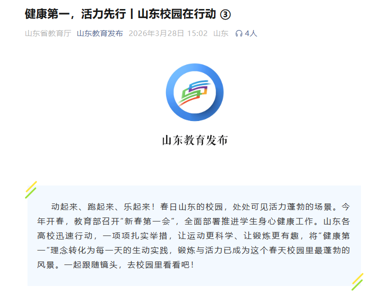 动起来、跑起来、乐起来!春日山东的校园,处处可见活力蓬勃的场景。今年开春,教育部召开“新春第一会”,全面部署推进学生身心健康工作。山东各高校迅速行动,一项项扎实举措,让运动更科学、让锻炼更有趣,将“健康第一”理念转化为每一天的生动实践,锻炼与活力已成为这个春天校园里最蓬勃的风景。一起跟随镜头,去校园里看看吧!