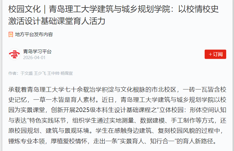 青岛理工大学建筑与城乡规划学院将以此次课程实践为契机,打造“课程思政+专业实践”的育人模式,以更多特色课程为载体,持续强化学风建设,厚植爱校荣校情怀,引导学生在专业成长中坚定理想信念,在热爱母校中砥砺奋进,成长为兼具扎实专业素养、优良治学作风与深厚家国情怀的新时代建筑人才。
