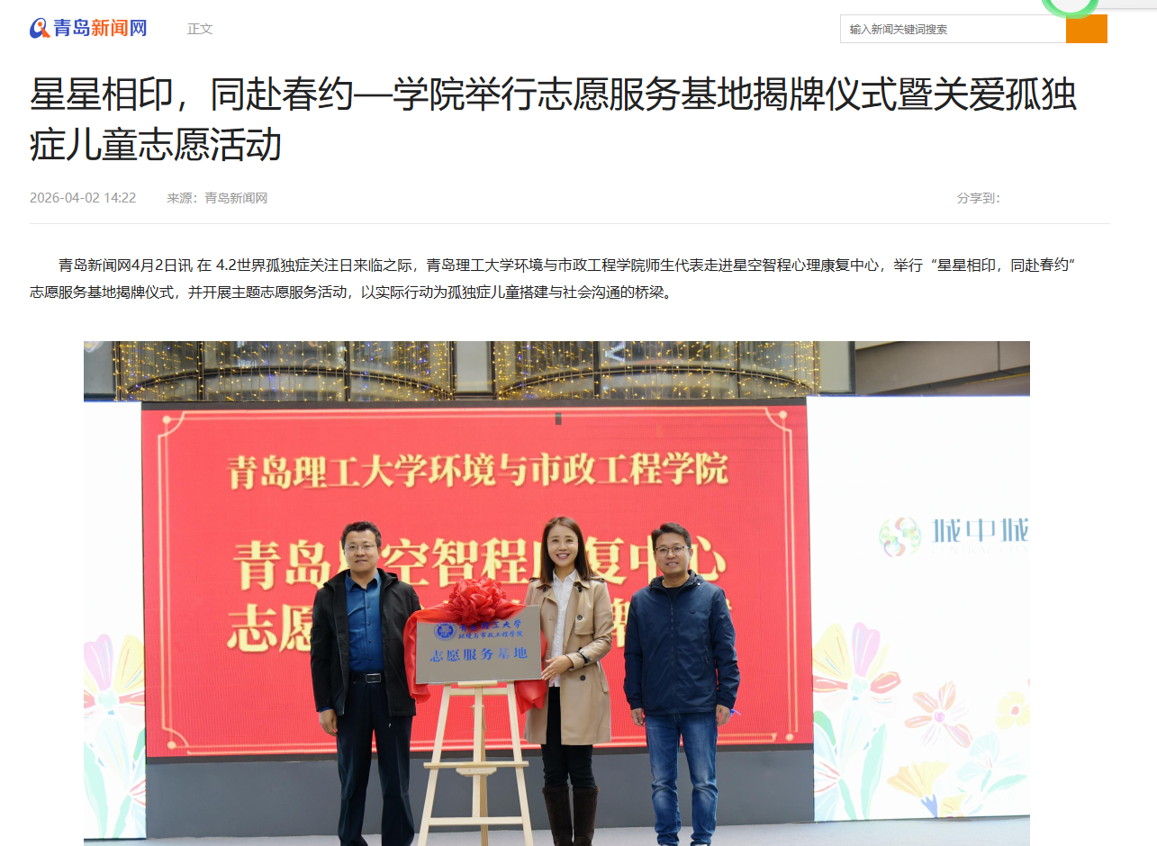 在 4.2世界孤独症关注日来临之际,青岛理工大学环境与市政工程学院师生代表走进星空智程心理康复中心,举行“星星相印,同赴春约”志愿服务基地揭牌仪式,并开展主题志愿服务活动,以实际行动为孤独症儿童搭建与社会沟通的桥梁。