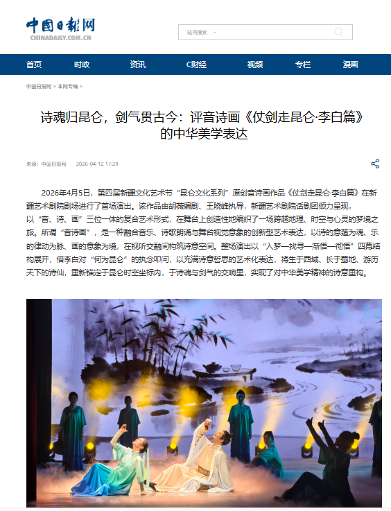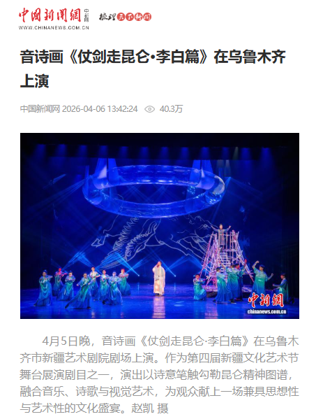 近日, 由我校艺术与设计学院王晓峰老师担任导演,李娟老师出任视觉艺术总监,新疆艺术剧院话剧团倾力呈现的剧目《仗剑走昆仑・李白篇》,作为第四届新疆文化艺术节 “昆仑文化系列” 原创音诗画作品在新疆艺术剧院剧场成功首演。剧目自上演以来,先后获得中国日报网,中国新闻网等多家主流权威媒体专题报道。