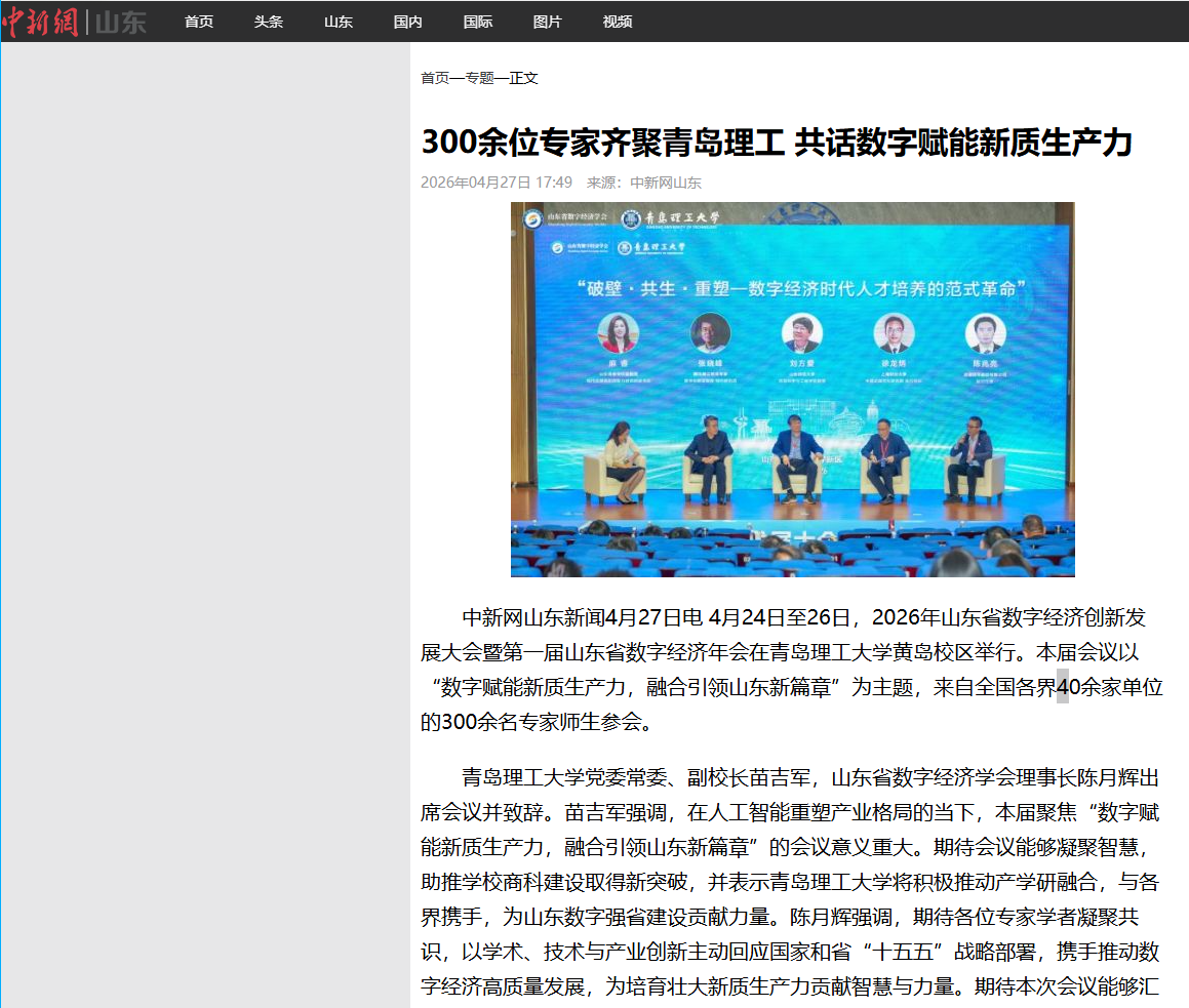 4月27日电 4月24日至26日,2026年山东省数字经济创新发展大会暨第一届山东省数字经济年会在青岛理工大学黄岛校区举行。本届会议以“数字赋能新质生产力,融合引领山东新篇章”为主题,来自全国各界40余家单位的300余名专家师生参会。