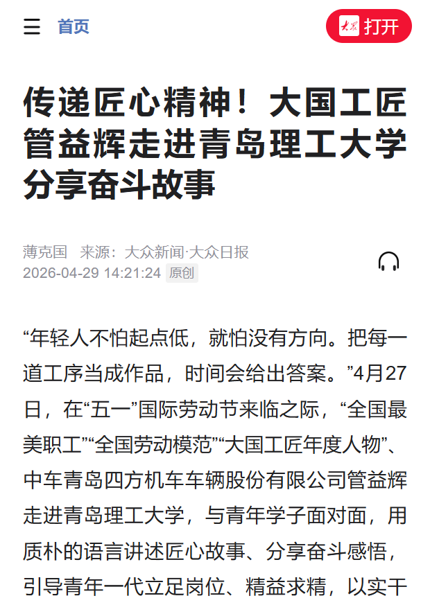 “年轻人不怕起点低,就怕没有方向。把每一道工序当成作品,时间会给出答案。”4月27日,在“五一”国际劳动节来临之际,“全国最美职工”“全国劳动模范”“大国工匠年度人物”、中车青岛四方机车车辆股份有限公司管益辉走进青岛理工大学,与青年学子面对面,用质朴的语言讲述匠心故事、分享奋斗感悟,引导青年一代立足岗位、精益求精,以实干担当书写青春答卷。