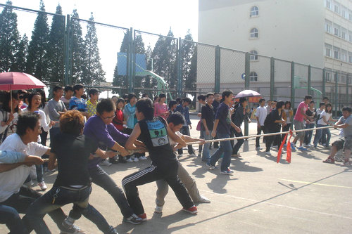 为了丰富同学们的课余生活,增加同学们之间的交流,经贸学院学生会体育部于9月23日下午2点在北院篮球场举行2011级新生拔河比赛。团总支书记王振老师、11级辅导员刘胜荣老师到现场观看。