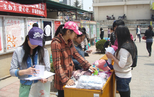 商学院爱心社和营销协会同学希望能够通过自己的努力做出一份贡献,他们积极联系商家,以较低的价格拿到商品,然后以合理的价格进行销售,在义卖的同时,宣传爱心奉献精神。活动筹得资金虽然不多,但却凝聚了同学们浓浓的爱心与真情。