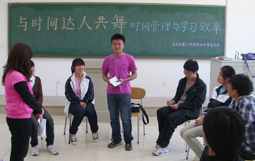 5月12日、13日下午,“阳光雨露”心理健康协会在黄岛新校区B326室举办了“我和你”人际关系团体辅导训练和针对大一下学期学生的“与时间达人共舞” 时间管理与学习效率团体训练。机械学院09级各班心理健康宣传员和阳光雨露心理健康协会朋辈咨询室同学参加了培训,协会指导老师、学院09级辅导员化磊老师现场指导。