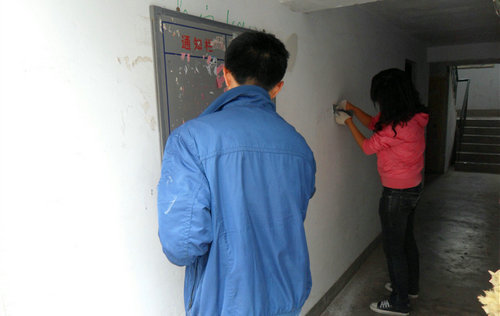 为了让小区居民有一个舒适的生活环境,志愿者们展开了清除校内小广告的环保活动。在居委会工作人员的指导下,志愿者们带着铲子、喷壶等工具,分散到小区各个角落。面对墙壁和橱窗上层层叠叠的广告,志愿者们毫不退缩,迎难而上,经过近两个多小时的努力,大家效率极高地完成了清除任务,宣传栏和楼道都焕然一新,得到社区工作人员的一致肯定。