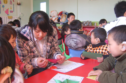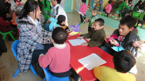 下午三点,志愿者一行19人来到青岛小百灵听力康复中心。孩子们看到志愿者,立刻坐好,断断续续但大声喊道“欢迎哥哥姐姐!”随后孩子们被分为四组,每组分配若干志愿者教孩子动手做风车。志愿者耐心地指导孩子们,一步步从卷纸、折纸、剪纸到最后固定。不一会儿,孩子们就人手拿着风车在活动室里开心地玩起风车来。有的来回跑带动风车,有的嘟起小嘴吹着风车,灿烂的笑容绽放在孩子的脸上,欢乐的气氛融化了每一个在场的志愿者。一个半小时的活动时间很快就到了,孩子们依依不舍牵着志愿者的手,大声告别“哥哥再见!,姐姐再见!”