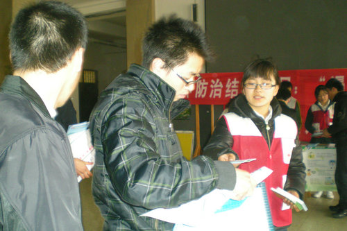 上午9点,志愿者们穿戴着红色团服为过往的同学们发放有关结核病基本常识的宣传单、宣传手册以及报纸。在此次活动中,同学们的热情高涨。虽然冷风习习,同学行色匆匆,但是看到我们的宣传纷纷停下脚步,认真的询问关于结核病的预防方法并拿着宣传单,准备向宿舍的同学宣传结核病的知识。