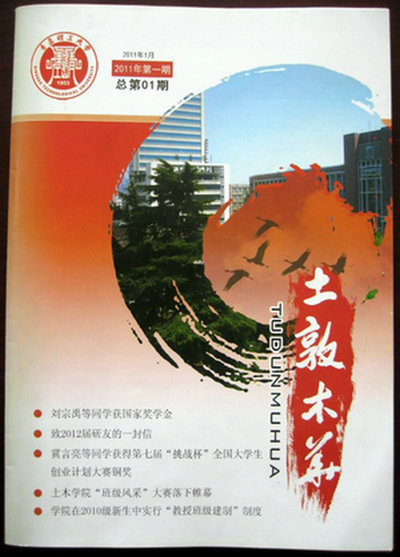 《土敦木华》院刊为土木学院内部16开本季刊,由团总支、学生会主办,党总支刘健书记为刊名题词,于广明院长为创号寄语。该刊内设多个版块,涵盖校园生活的主要方面,必将成为土木学院校园文化建设的新阵地。(土木学院)