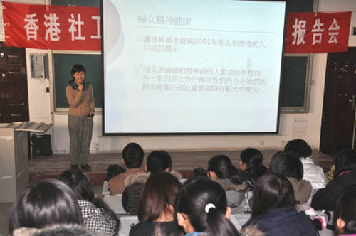 报告会上,区洁莲女士以“由个人成长到社区能力建设”为主题,与大家分享了自己从事社会工作28年的工作经验与深刻体会。首先,她从妇女精神健康入手,解释了个人问题背后所隐藏的的不利因素;接着,区老师又谈到了妇女能力建设问题,进一步阐明社会工作的基本信念,同时分享了关于妇女合作模式的经验;最后,区老师做了关于“生命展望”的社工发展模式,带领大家共同探讨社工发展的趋势与方向。报告会结束后,区老师与现场的同学进行交流,为同学们答疑解惑。