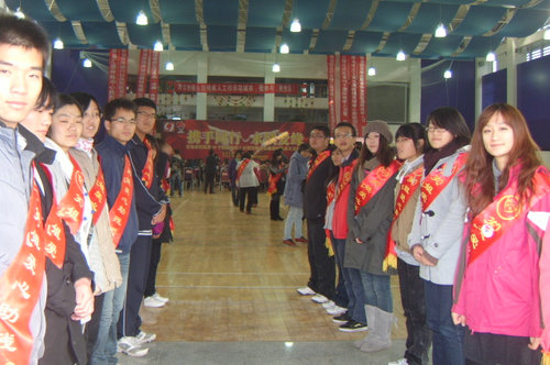 早上8点,我校第一批志愿者到达青岛市残联中心体育场排演节目,下午1点,另一批志愿者到来,他们身披红色的绶带,在门口引导到场的嘉宾和残疾人签到、入座,他们洋溢的笑容,热心周到的服务形成了一道亮丽的风景线。下午2点,活动正式拉开序幕。随着主持人宣布庆典活动的开始,青岛社会各界纷纷上台献艺以庆祝这喜庆的日子,一首首动人的歌曲,一段段优美的舞蹈,以及话剧和配乐朗诵深深感动着每一位在座的观众。其中由我校志愿者献上的歌曲串烧得到了大家的好评,演出进行的过程中,志愿者仍不忘给残疾人朋友送水和引导搀扶他们去洗手间。