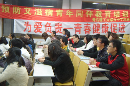 为了普及大学生预防艾滋病的基本知识。11月21日晚六点半,红十字志愿服务团联合玛丽斯特普你我健康服务中心在一教105阶开展了“预防艾滋病青年同伴教育”活动。