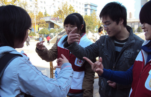 活动从上午10点开始,历时两个多小时,推广的手语类别达八组。广场上,立冬后的寒风伴着呼呼声向人群袭来,志愿者们不顾自身寒冷,耐心的向同学们讲解手语。前来学习的同学有的两三结伴,有的三五成群,志愿者们热情讲解,不耐其烦地一遍一遍的给同学们示范。大家学了一组又一组,身在其中不亦乐乎,有的同学当即便用手语与别人交流起来,还有的同学热情的与志愿者打着手势合影留念。瞬时间,偌大的广场成为了手语的天堂,大家在享受着用手语交流的同时也在传递着一份关爱聋哑人士的美好心愿。