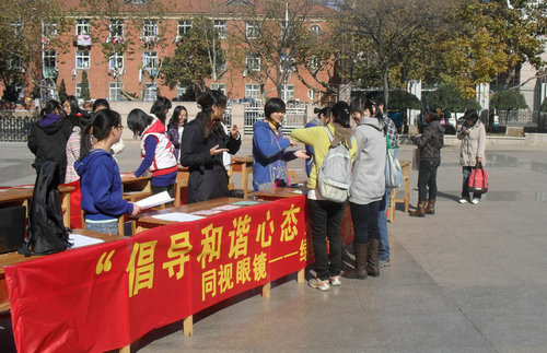 11月8日,由绿丝带健心协会主办、“同视眼镜”赞助的“关爱生命,共享阳光——‘城市让聋人生活更美好’手语推广活动”在四方校区科技广场举行。