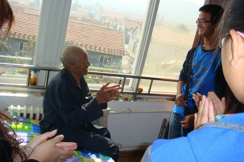 上午9点左右,同学们来到敬老院,三四人为一组,进入老人们的房间,帮助老人们打扫卫生,剪指甲,梳头发……,为老人们做一些力所能及的事情。有的同学陪老人聊天,听老人讲一些过去的往事,在回忆中感受我们所不曾经历的岁月。有的同学为老人表演节目,表演之余,弹吉他的同学还教老人弹奏这原本属于年轻人的乐器,在动人的吉他声中每个人都欢快而热情的和声而唱。欢乐的时光总是短暂的,为了不打扰老人们午休,在将近中午时,爱心社的同学们告别老人,静静的离开了敬老院。