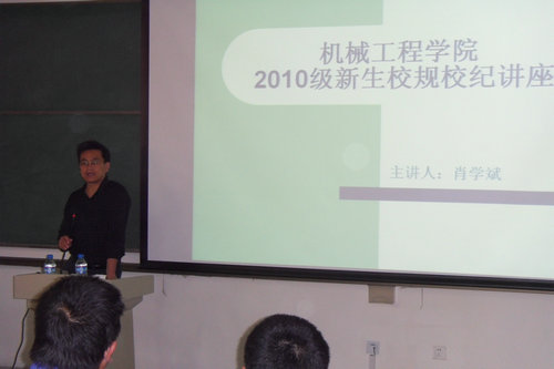 10月14日下午,机械学院在新校区202教室对2010级新生进行了校规校纪教育,党总支副书记肖学斌给10级新生做了一场生动的校规校纪讲座。