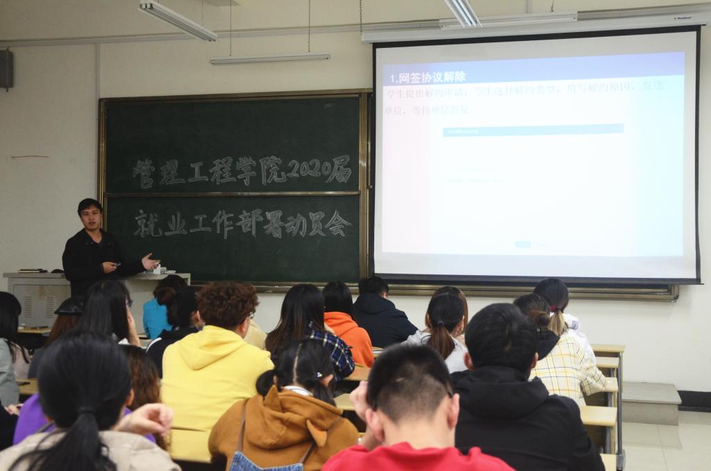 为进一步加强2020届毕业生就业指导工作,动员毕业生积极参加就业工作,11月6日下午,管理工程学院在嘉陵江路校区主教学楼B114教室举行了2020届就业工作部署动员会。管理工程学院党总支副书记于利俊、就业工作辅导员张翔、16级辅导员张心怡参加了此次会议。