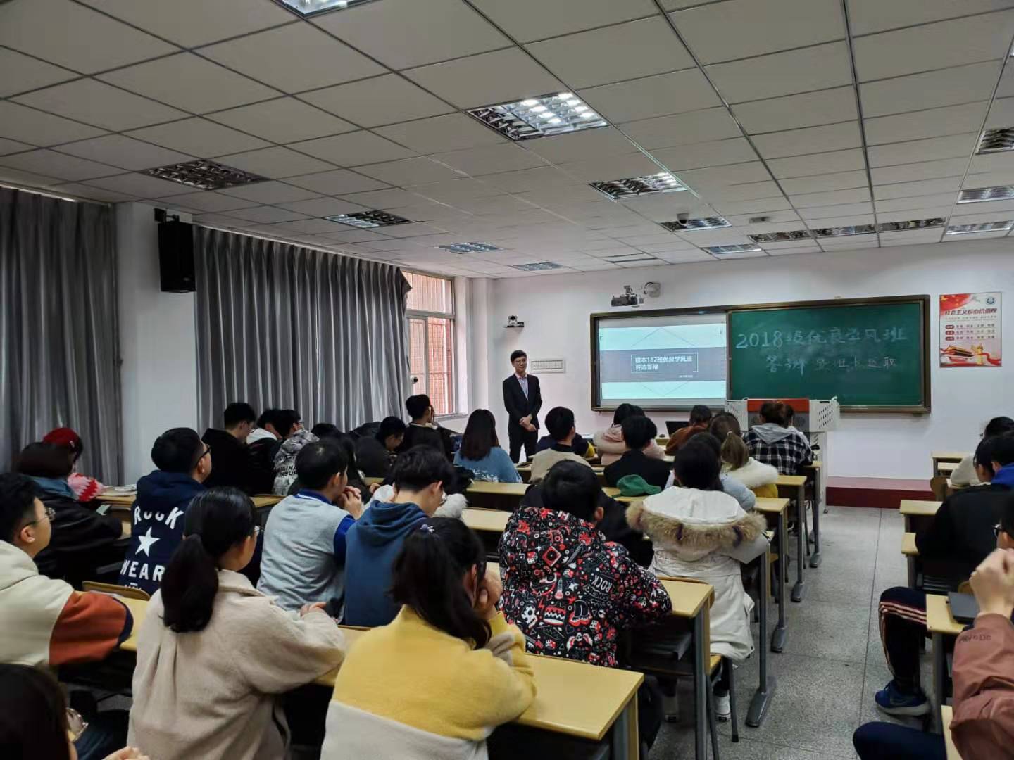 评议会以班长述职、老师点评、同学们提问交流的方式有序展开。各班长为本次述职做了精心准备,以ppt形式展示了各自班级在2019年所参与的活动、取得的成绩,分享了以班长为代表的班委会在日常学习生活中的管理、服务方式,在协助辅导员、专业老师过程中的上传下达工作方法以及自己在工作中的体悟。其中,建本182班长董周正以学习成绩零挂科、活动比赛零掉队、油腻懈怠零容忍、荣誉奖项凌绝顶,以及一个态度不变、一个传统延续、一个家庭分享、一个团队互助、一条主线紧抓的“四个零五个一”为主线,全方位的展示了班级、班委会在2019年度的努力付出和所获得的成绩。