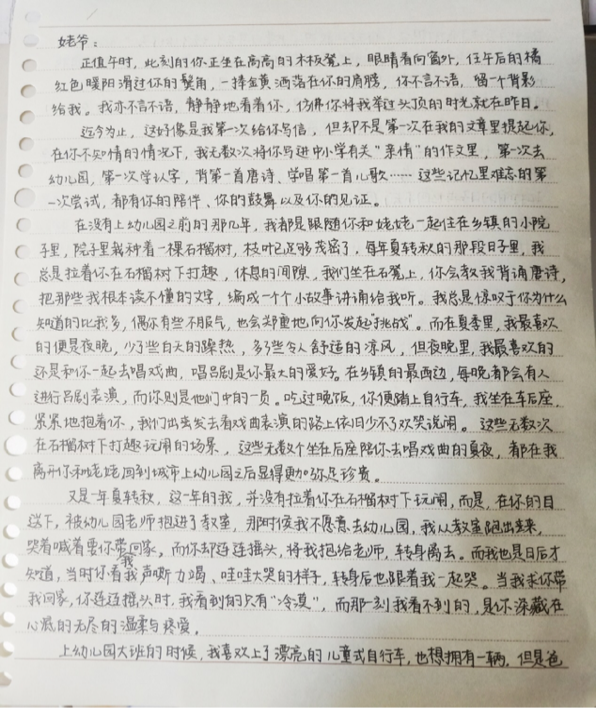 写给步履蹒跚的你:“难以忘记的,是无数个在石榴树下乘凉欢笑的夜晚,是在自行车后座抓紧姥爷衣襟的安心与喜悦”,财管182班程坤睿以“写给步履蹒跚的你”为题,用一篇小文章回顾了与姥爷二十年的相处历程。他说:“初春的和煦阳光里,夏夜的凉风里,嘈杂的戏院里,姥爷给我讲故事、唱戏曲的画面仍旧历历在目。”常年的求学生涯,程坤睿很少有像现在这样充裕的时间陪伴姥爷,而不经意间,光阴催人老,独自走路、高唱戏曲都已成为姥爷做不到的事情。“没关系,姥爷,我会牵着你的手,陪你走好每一步。”这是程坤睿对姥爷的承诺,而他也用这段宝贵的慢时光更深刻的体会了孝老爱亲的价值。