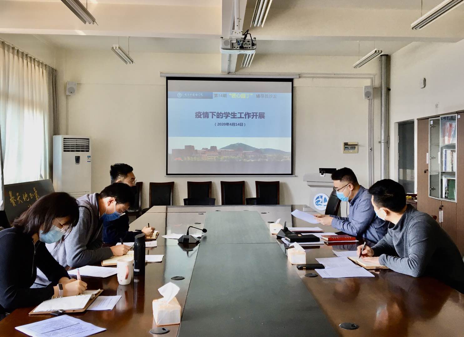 4月14日上午,人文与外国语学院在主教学楼A410会议室召开第十四期匠心园丁辅导员沙龙。此次沙龙主题为“疫情下的学生工作开展”,由学院党总支副书记王振主持,学工办主任并分团委书记马松、辅导员陈刚、贾舒文、王才升参加。