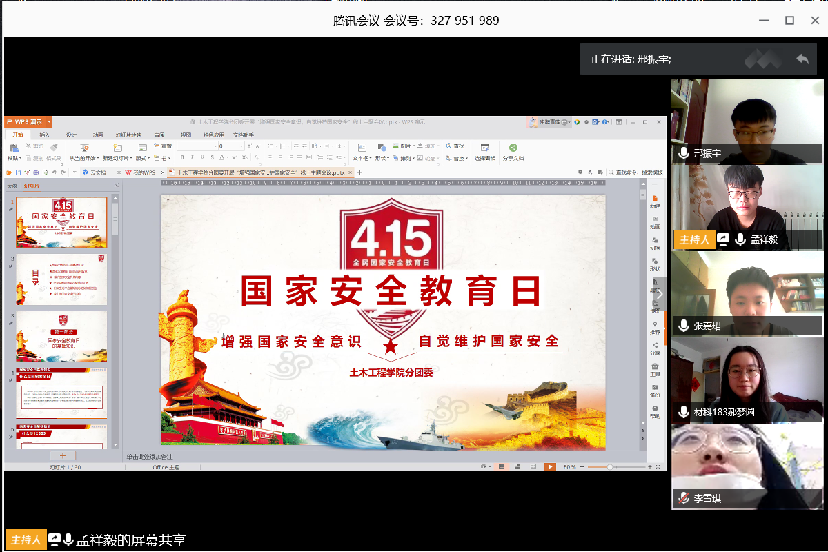 在第五个全民国家安全教育日到来之际,为进一步加强大学生国家安全意识,自觉关心、维护国家安全,4月15日,土木工程学院分团委开展“增强国家安全意识,自觉维护国家安全”线上主题会议,学院分团委成员及各班团支书积极参加会议,会议由分团委副书记孟祥毅主持。