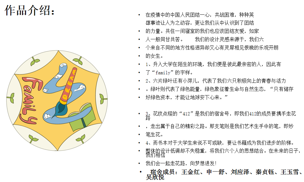 活动开展以来,学院学子以宿舍为单位积极参与,宿舍成员通过qq群等方式一起讨论作品的设计和构思,通过一个周的时间,齐心协力完成了作品。在体现宿舍凝聚力的同时,将个人在抗疫期间的思考和感悟寄托于作品中。本次活动共收到作品72件,最终,5公寓439宿舍创作的作品《必胜》和5公寓412宿舍创作的作品《family》凭借其精妙的构思获得了一等奖。