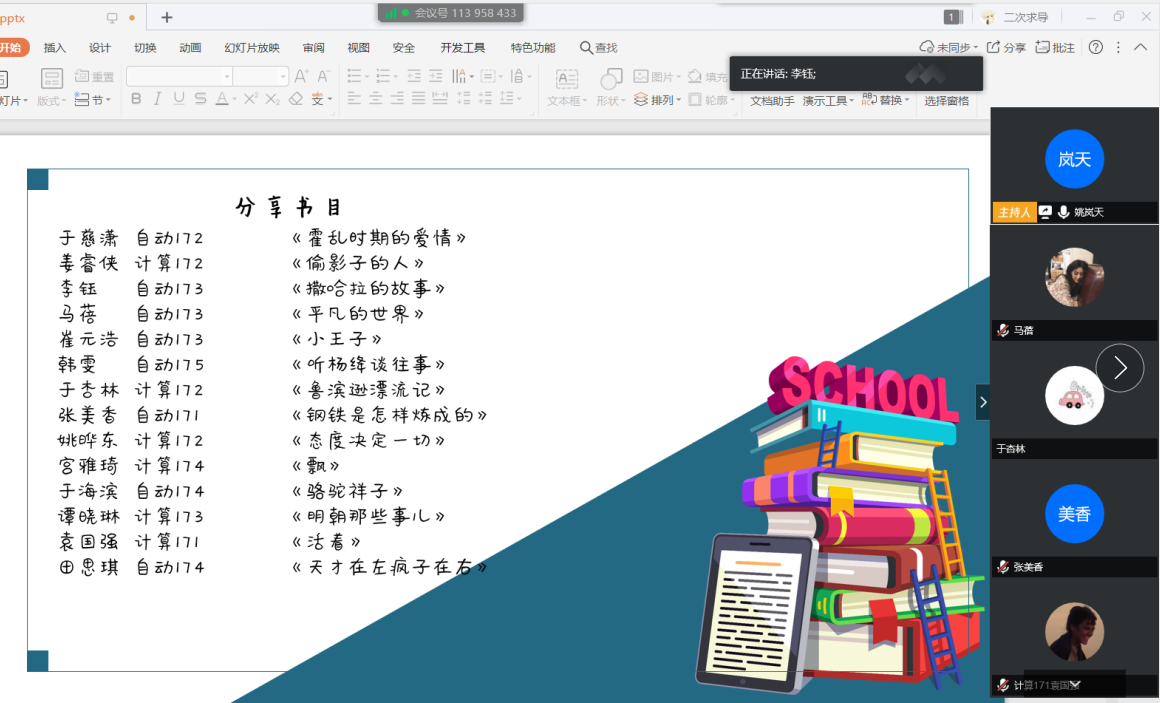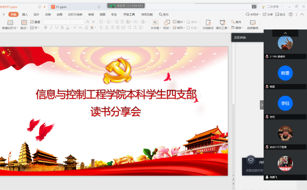 4月23日,信息与控制工程学院本科学生第四支部于腾讯会议召开线上“4.23读书分享日”主题活动。本次会议共有16名同志参加。会议由支部宣传委员高腾飞主持。