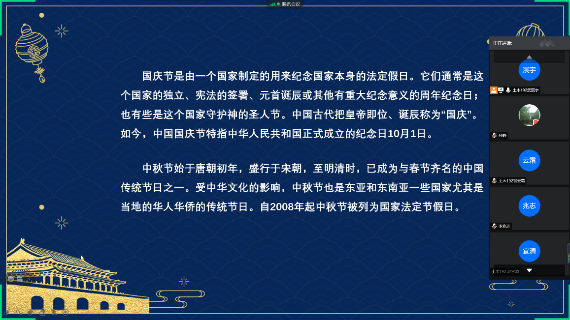 中美192班团支书高玉萍带领同学们一起观看了10月1日天安门升旗视频,同学们纷纷讲述新中国成立以来所取得的辉煌成就,让同学们由衷发出此生无悔入华夏,来生还做中国人的感叹。
