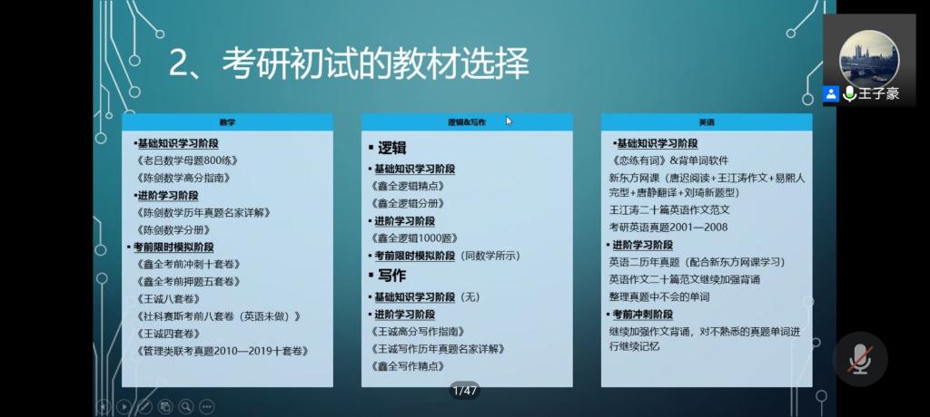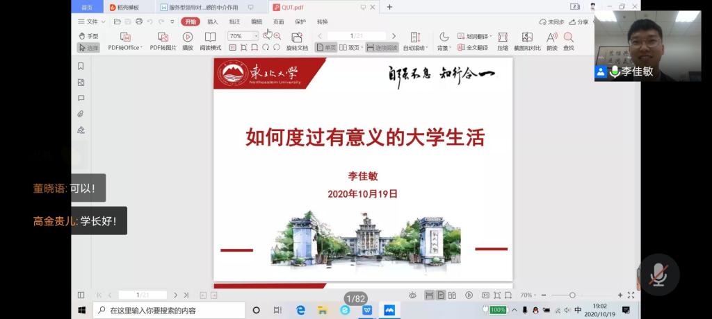 针对不同专业的不同考研方向,分别邀请了财务管理刘永川、王娟、夏嘉一,会计学王子豪、公续玲、高凯,市场营销李佳敏、黄森锐等8位正在攻读研究生的优秀毕业学子担任交流会主讲人,他们来自天津大学、中国海洋大学、东北大学、吉林大学、河海大学等学府。8位学子分别分享了自身的考研经验和大学生涯规划,其中,王子豪为会计学新生量身定制了本科全阶段的学习计划;公续玲从思路、决策到时间安排,全方位为新生展示了考研道路的风景和荆棘;高凯作为曾经的院学生会主席,从学习、学生工作、科技创新、社会实践等多个维度用渐趋渐广的眼界去帮助新同学们遨游知识海洋的航道;保研学子李佳敏虽然毕业2年了,但始终牢记母校的栽培,以身作则,向学弟学妹们传承担当奉献精神。每场活动的最后,主讲毕业生都通过线上交流的方式回答了新生们的问题以及疑惑,照亮了新生们前方迷茫的道路。