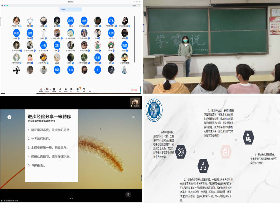本次活动分为线上和线下两种形式,分别借助腾讯会议、主题班会积极互动,多名优秀代表解答疑难共促成长。活动过程中,各学霸就自己的学习经验与大家进行分享交流。社工专业杨雯雪就如何提高学习效率提出建议;广告专业杨旭表示专业学习需要多想多做多看。众多优秀学子充分发挥自身的模范带头作用,积极交流分享学习经验,强调树立正确的学习态度,同时分析目前班内普遍存在问题,帮助同学正确认知目前学习状态,悉心讲解有效改善方法,督促同学努力提升自身素质。在场同学全程认真听讲并纷纷表示受益匪浅。日语182卢筱涵表示通过本次活动学习到合理分配时间的有效方法,进一步明确了未来规划,并将为自己近期学习情况进行归纳总结。