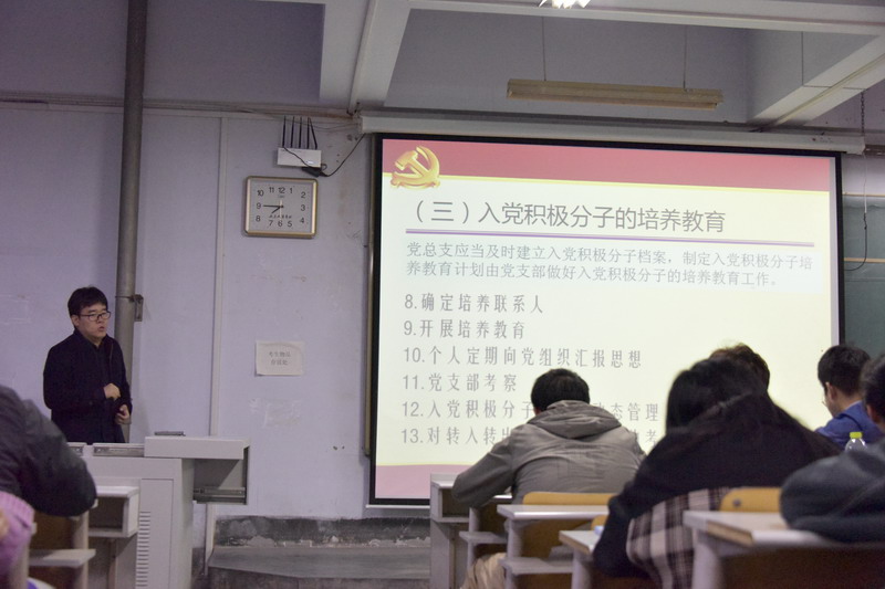 培训会上,刘超向大家解读了新形势下发展党员工作的要求、《细则》主要修订的内容特点和发展党员程序、工作流程及注意事项。就新形势下发展党员工作“控制总量、优化结构、发挥作用、提高质量”四个总要求做了详细解读,强调要把政治标准放在首位,做到党要管党、从严治党。此外,刘超向大家介绍了发展党员的程序,提及了预备党员的接收、教育和考察以及预备党员转正及档案存档的步骤,让同学们对关于如何递交申请及入党积极分子的确定和培养教育有了一定的了解。