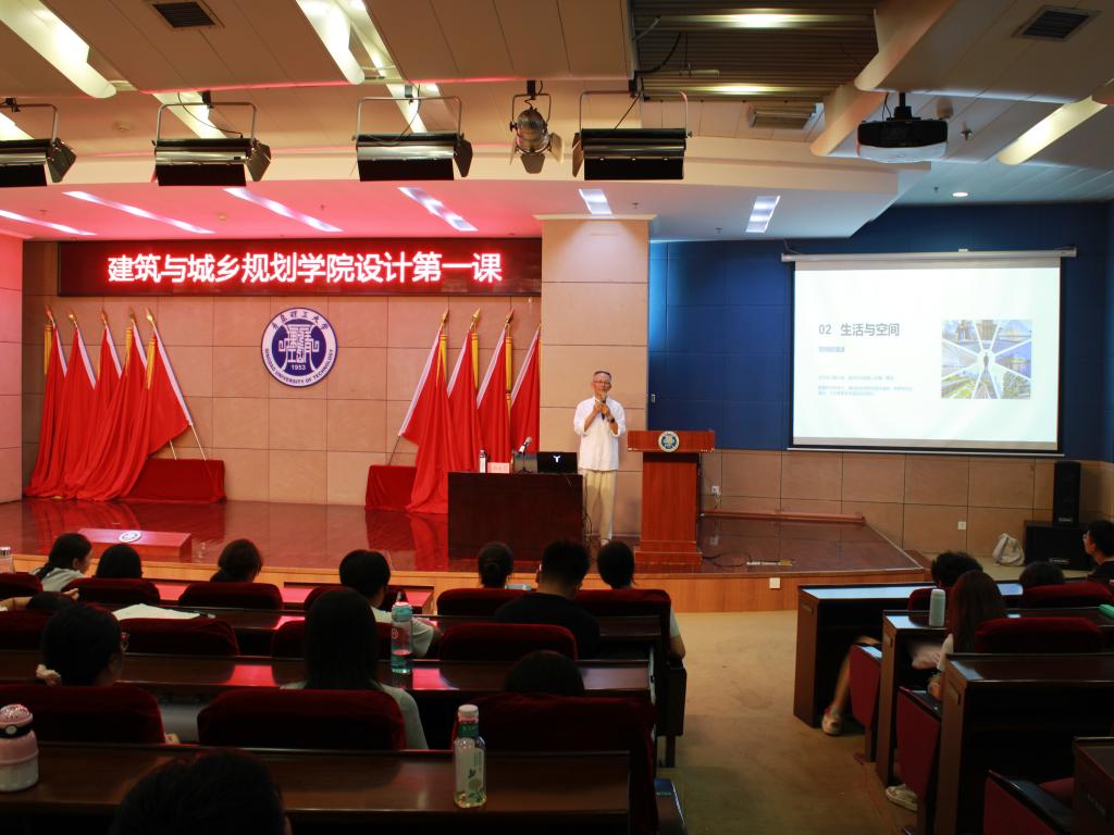 9月17日下午,一堂特别的设计概论课在市北校区报告厅举行,建筑与城乡规划学院教授,全国高等学校建筑学专业指导委员会委员郝赤彪为学院2025级全体新生带来“名师第一课”,为初入设计殿堂的学子们带来了一场思想深邃、内容丰富的专业启蒙讲座。讲座由副院长(主持工作)解旭东主持。