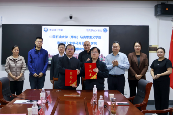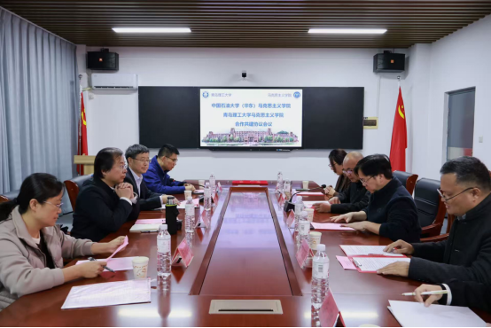 为深入贯彻习近平总书记关于教育的重要论述特别是学校思政课教师座谈会精神,贯彻落实《关于深化新时代学校思想政治理论课改革创新的若干意见》(中办发〔2019〕47号)和《山东省深化新时代学校思想政治理论课改革创新行动方案》(鲁教组字〔2020〕1号)、《中国石油大学(华东)与青岛理工大学战略合作协议》要求,实现协同发展、合作提升。10月22日下午,中国石油大学(华东)马克思主义学院党委书记姚成郡、院长张瑞涛、副院长崔军伟、党委副书记李宝玺一行4人,莅临青岛理工大学马克思主义学院开展合作交流。学校党委常委、统战部部长、马克思主义学院党委书记陈伟,院长华章琳、党委副书记兼副院长石峰、兼职组织员李璐参会。合作共建活动由马克思主义学院副院长李龙强主持。