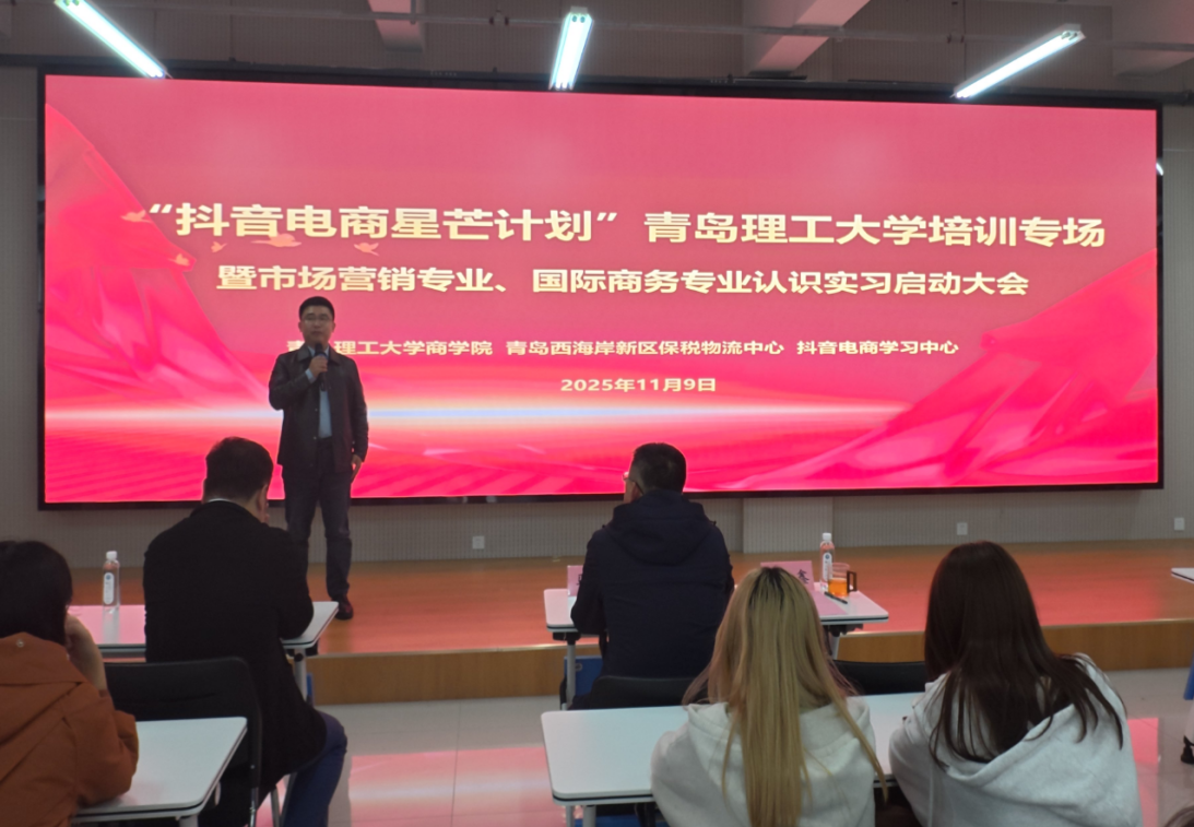 11月9日,由商学院、青岛西海岸新区保税物流中心、抖音电商学习中心联合举办的“抖音电商星芒计划”青岛理工大学培训专场暨市场营销专业、国际商务专业认识实习启动大会在黄岛校区商学院楼401报告厅举行。商学院院长云乐鑫、青岛西海岸新区保税物流中心有限公司总裁马骥、中日韩消费专区电商体验中心总经理陈湘、抖音电商金牌认证讲师王旻辉,市场营销系教师代表、学院2024、2025级市场营销专业和2023级国际商务专业全体学生到场参加。培训由学院市场营销系主任韩杰主持。